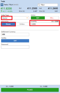 Select market then toggle between Shares/Dollars depending on your preference. Enter fractional or dollar amount.